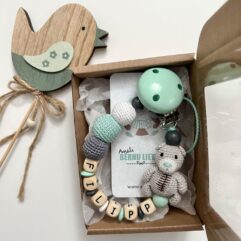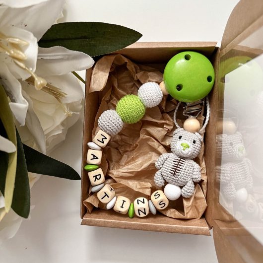 Personalized crochet and wooden beads pacifier clip with cute teddy bear.