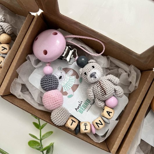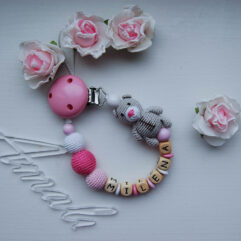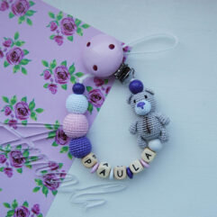 Personalized crochet and wooden beads pacifier clip with cute teddy bear.