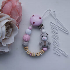Personalized crochet and wooden beads pacifier clip with cute teddy bear.