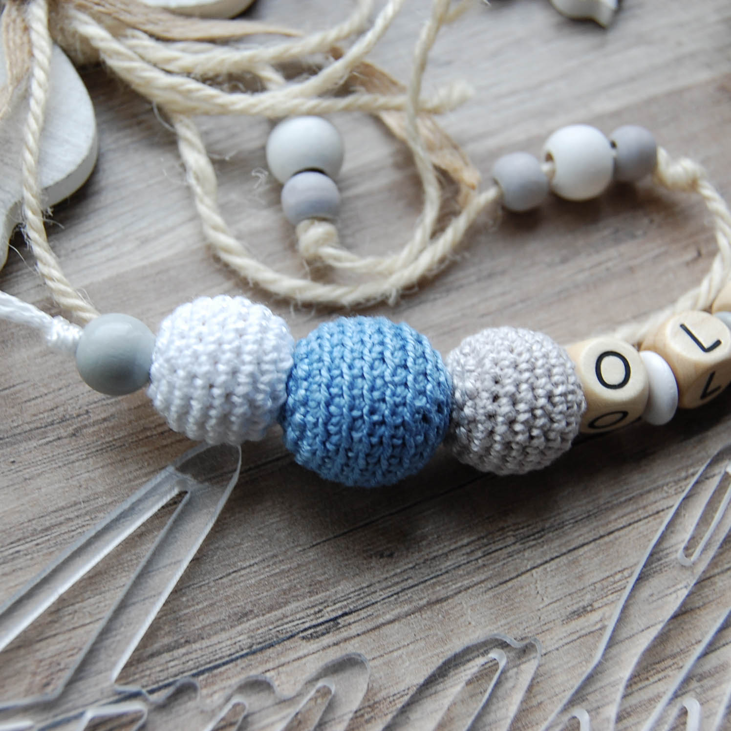 Personalizēts knupīša turētājs ar lāčuku, no koka un tamborētām pērlītēm.