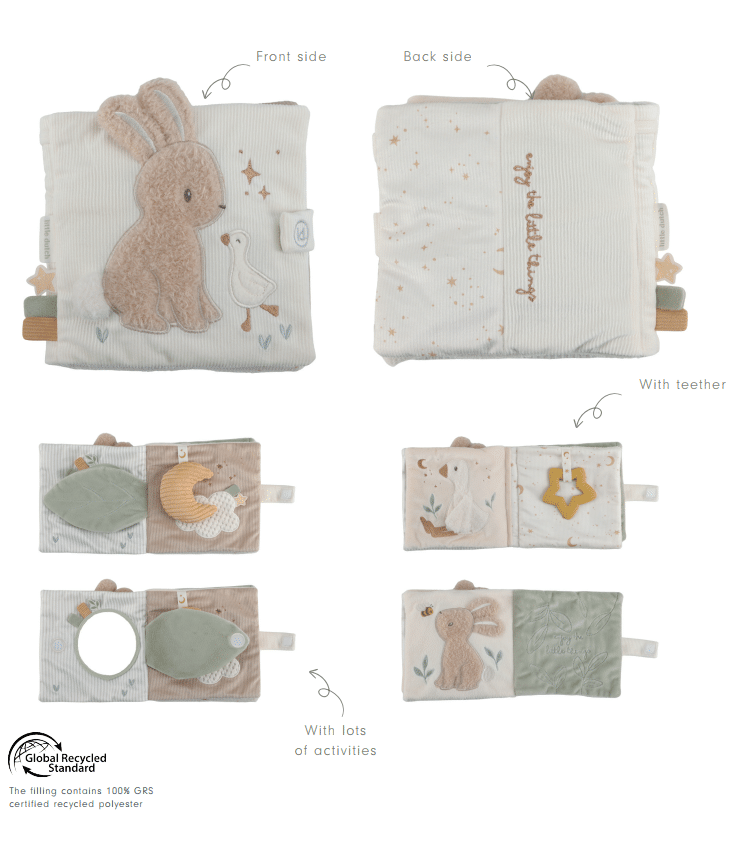 Little Dutch aktivitātes grāmata Newborn Naturals – ar šo mīksto aktivitāšu grāmatu jums nebūs garlaicīgi. Zaķītis un mazā zoss aizvedīs jūs rotaļīgā piedzīvojumā. Ar dažādām tekstūrām un aktivitātēm, piemēram, spoguli, grabuli un paslēptām rotaļlietām, ir daudz ko atklāt. Mīkstajai grāmatai ir arī dažādas etiķetes, kuras var aptaustīt. Šī grāmata ne tikai stimulē maņas, bet arī ir piemērota roku-acu koordinācijas attīstībai.