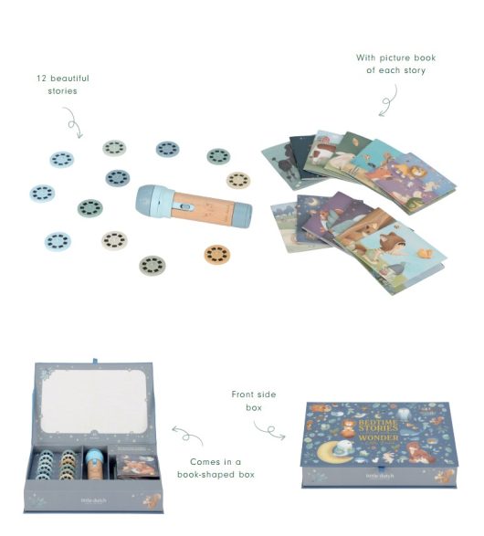 Brīnumi atdzīvojas ar šo Little Dutch stāstu projektoru bērniem ! Šajā īpašajā lukturītī ir 12 diski , no kuriem katrs stāsta savu stāstu, izmantojot skaistas un unikālas ilustrācijas, kuras var projicēt uz sienas. Katru stāstu papildina atbilstoša ilustrēta grāmata , kas veicina stāstu stāstīšanu un iztēli.