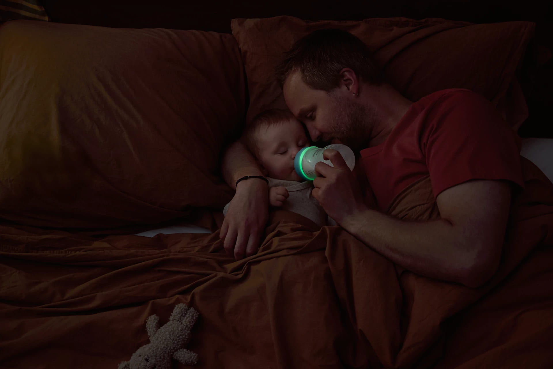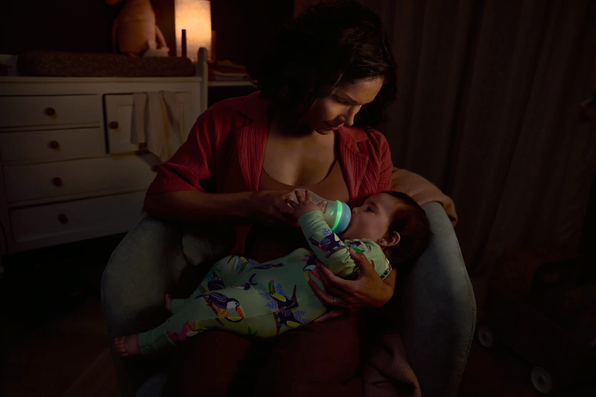 - Tumsā spīdošais knupja riņķis, lai barošana naktīs būtu ērtāka