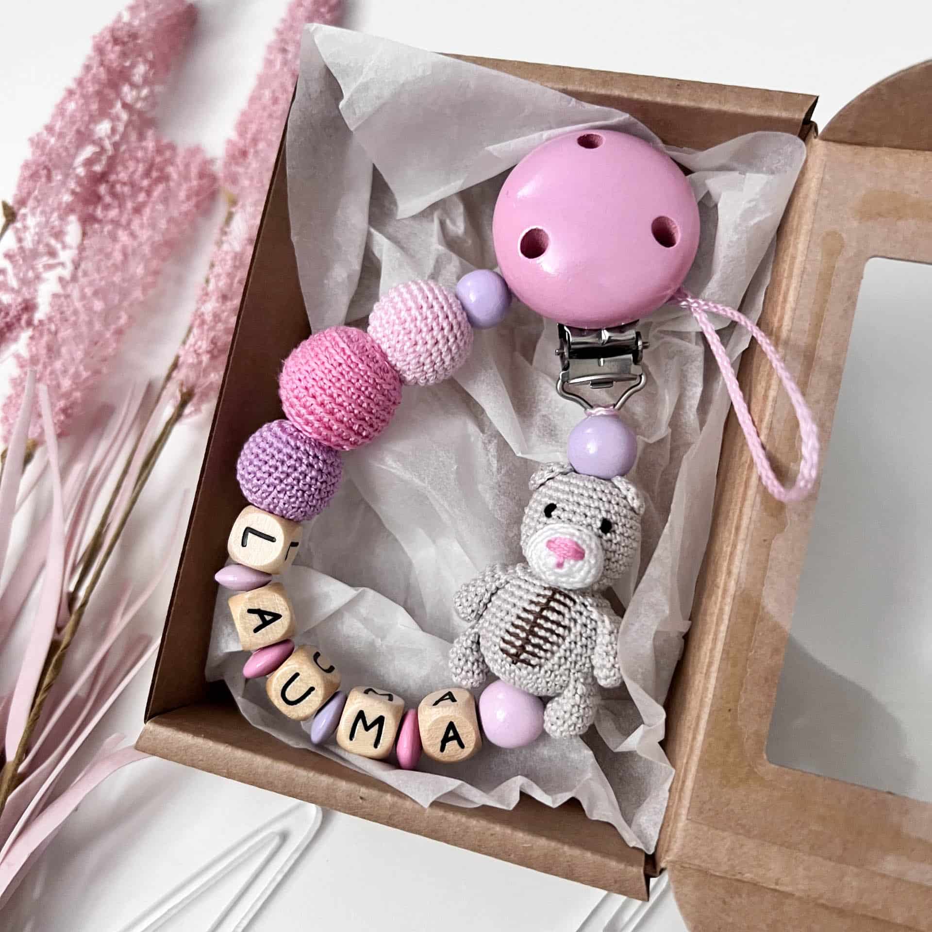 Personalizēts knupīša turētājs ar lāčuku, no koka un tamborētām pērlītēm.