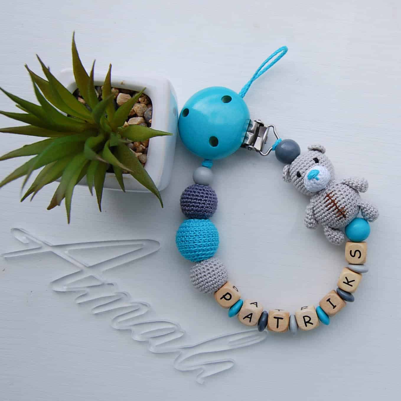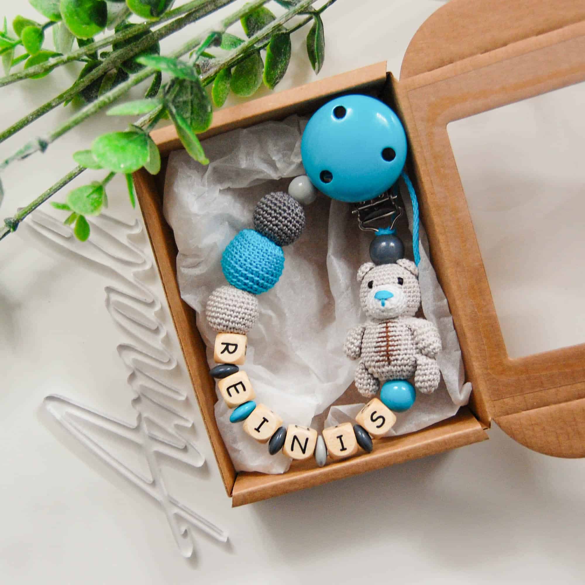 Personalizēts knupīša turētājs ar Lāčuku – Tirkīzzils/pelēks