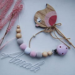 Держатель для соски из деревяннык и обвязаных бусин.